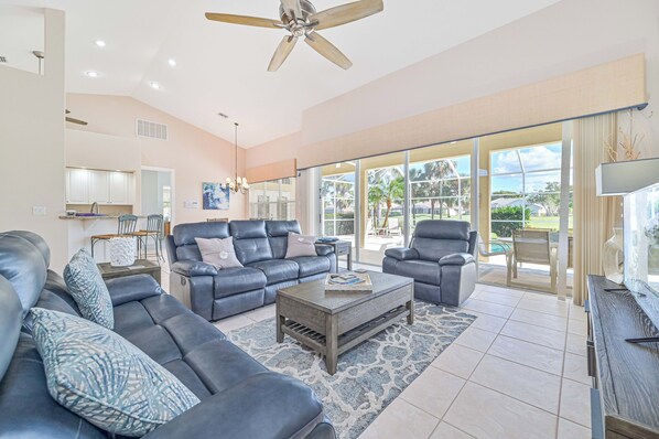Casa de vacaciones perfecta! Amplio 3 dormitorios más den, 2 baños, con piscina climatizada y jacuzzi con vistas al campo de golf. Techos altos abovedados, zonas de estar con frescos mosaicos, alfombras en 3 dormitorios. La sala está revestida de azulejos y tiene un sofá cama. Área de cocina abierta con encimeras de granito. Comedor formal y desayunador comedor. Acceso a Internet de alta velocidad. 2 televisores de pantalla plana en la sala de estar y el dormitorio principal, TV en la cama de invitados, 1 DVD, VCR y sistema estéreo con sonido envolvente en la sala de estar. Disfrute de las vistas de la piscina desde la suite principal, el segundo dormitorio, el comedor y la sala de estar. Disfrute de la piscina y el spa en su lanai filtrada. Cocina de verano con refrigerador incorporado, parrilla de barbacoa y un montón de muebles de jardín para descansar. Esta casa de vacaciones está bien equipada y es ideal para el entretenimiento. Código de propiedad de Realty Group of SW Florida SW28415. Wi-Fi incluido.
