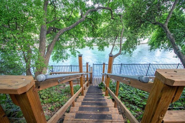 Disfruta de tu acceso privado al río. El acceso a la escalera conduce directamente al río Comal, de aguas cristalinas.