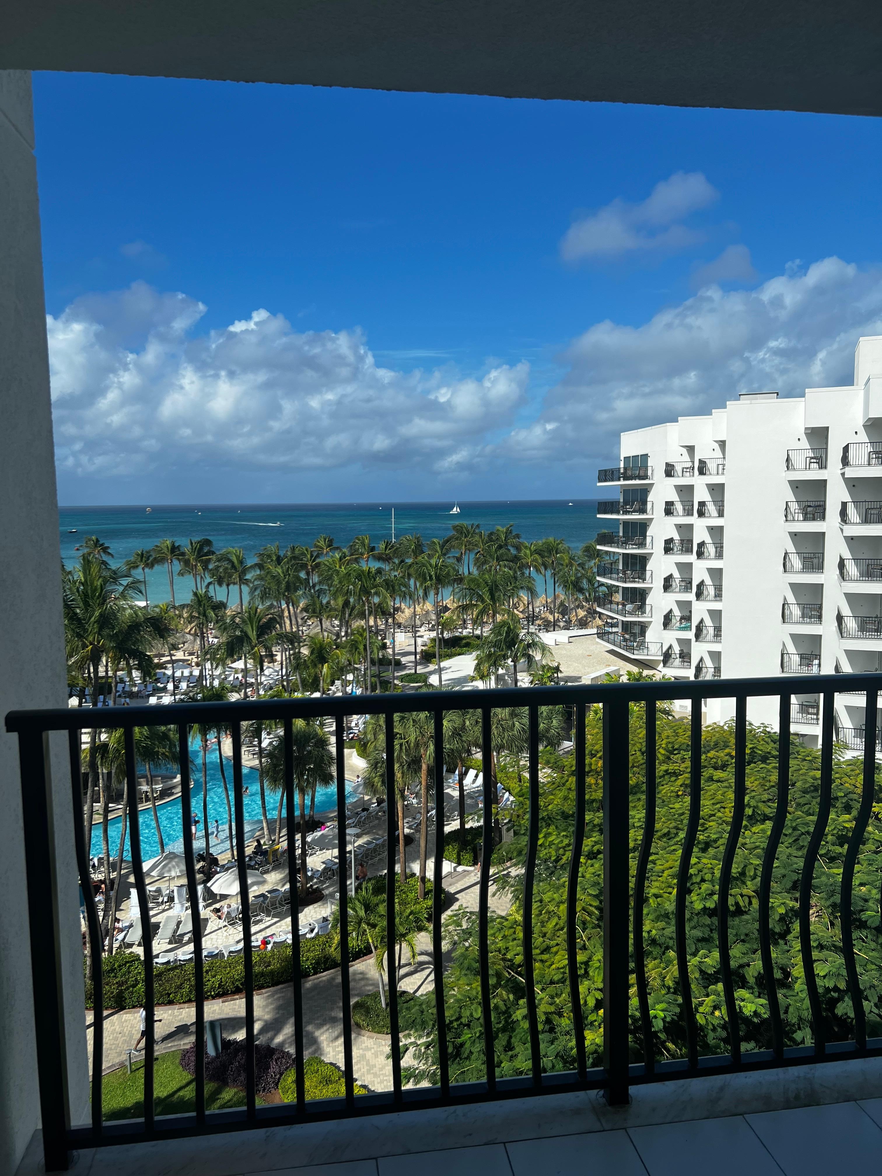 Very nice hotel - like new room with gorgeous ocean view and balcony. Two pools - one adults only, very well maintained. Enjoyed the palapas on the beach and even though I never reserved one, it seemed I was always able to find one available. Live music at night was very nice as well. While our check in was not ideal, everyone else there was super nice. A few options to eat right at the hotel which we appreciated when didn't feel like walking or taking a cab. If we visit Aruba again, would love to stay here for sure!