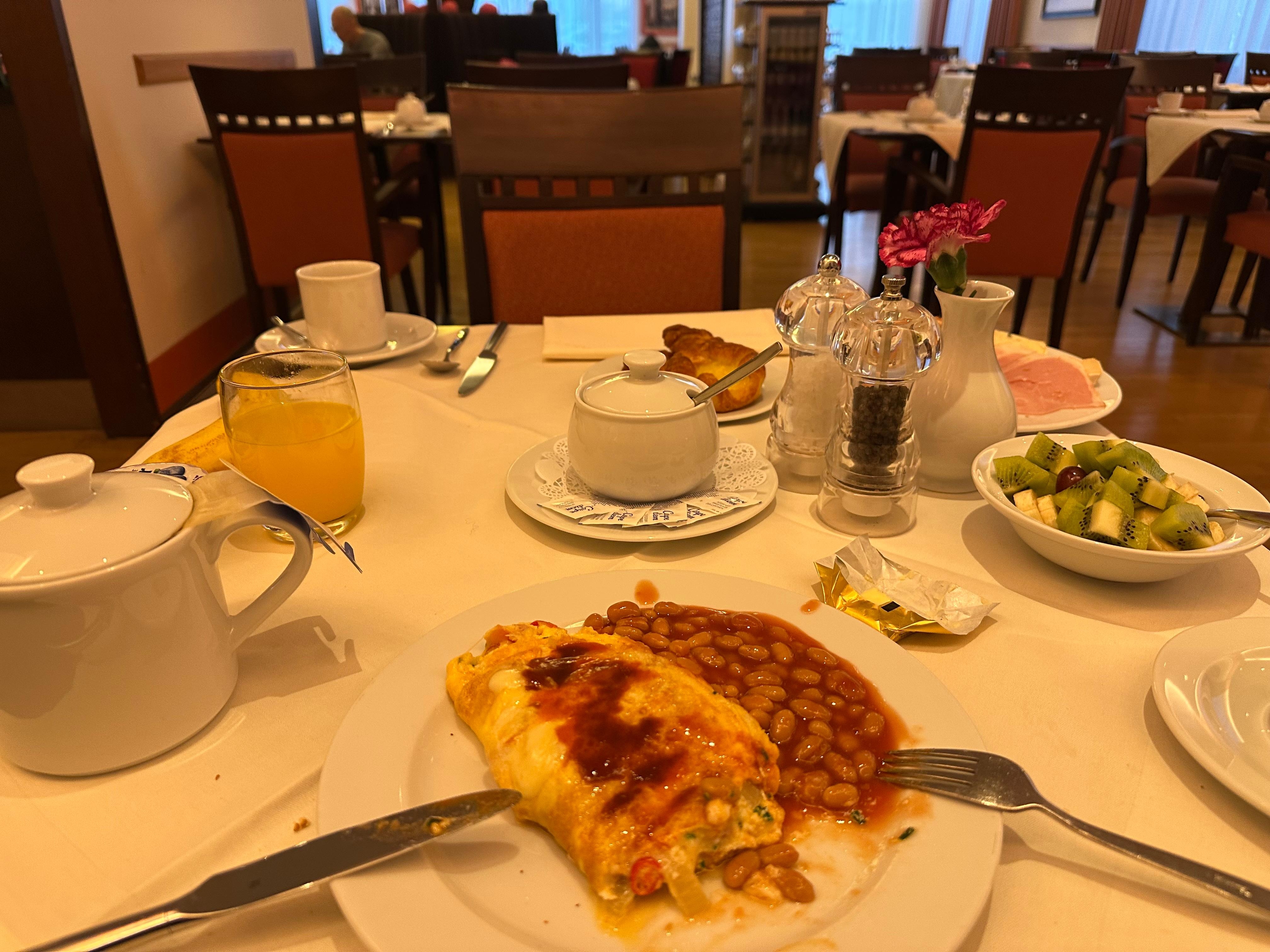 The breakfast variety and service were excellent. Also, Waiter service at your table for Tea or Coffee. The hotel and the staff service were also excellent. The only comment on room for improvement was that the breakfast bar food area was a little congested, making it difficult to move around other guests even when the room was not too busy. But altogether a very enjoyable stay and only a 5min walk from the main station, which had many food outlets and a 15min walk from the main Christmas Market.