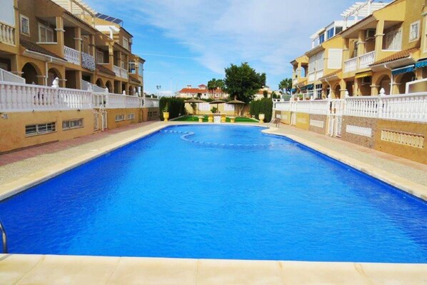 Nuestro apartamento con aire acondicionado, dos dormitorios, un baño, una cocina bien equipada y una sala de estar. En el salón hay un balcón en el que se encuentra una mesa con sillas. Suba por las escaleras hasta el solarium (sol para tomar el sol / tomar el sol) con muebles de jardín y hermosas vistas de las cabañas españoles y por supuesto el mar azul. El área de la vivienda está vallado. Dentro del complejo - menos de un minuto del apartamento hay una piscina limpia mantenido (con piscina infantil para los niños), sombrillas exóticos y una zona para tomar el sol para uso exclusivo de los huéspedes. Nuestro piso es un gran punto de partida para explorar todos los principales pueblos y ciudades ricas en monumentos y lugares de interés (Alicante, Murcia, Cartagena, Elche - a unos 40 km) o la capital de la región de Valencia (a unos 200 km. Ciencia y mayor acuario y un delfinario de Europa). La mayor parte de los caminos de estas ciudades son las carreteras libres, por lo que podemos alcanzar con seguridad y rápidamente a nuestro destino.