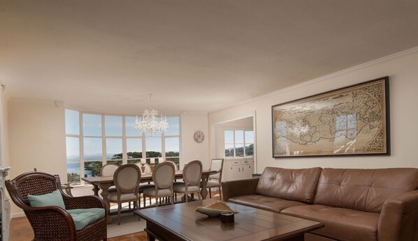 Se preparan para ser deslumbrado: panorámicas vistas de la bahía durante el día y las luces brillantes de la ciudad por la noche. Vistas al mar abundan en las áreas de estar y el balcón (con una mesa bistro y barbacoa). Sofás de cuero frente a la gran pantalla de TV plana y una chimenea de gas ornamentada.