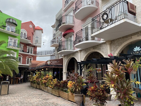 Spent 5 nights here over New Years… Pros: Very clean, very well appointed with soap, trash bags, towels, beach towels & blankets, washer & dryer with laundry detergent, super comfy beds, two flat screen TVs, stove, microwave, dishwasher, small bistro table for 2 (4 chairs but that would be tight for dining), Juliette balcony overlooking large courtyard, two sinks in bathroom, elevator to 4th floor where the room was. Kitchen and living areas were modern and up to date. Cons: Way too noisy, music from restaurants play all day and night, didn’t know there was a New Year’s Eve party in the courtyard with several hundred people partying with a live band until 2am (owner should have known and let us know, we would have not booked if we knew), other nights not quite as bad, but still it was a huge annoyance, toilet ran and flushing was difficult at times, you need to be comfortable with stepping up and down two steps into the shower, very precarious especially when you are wet. Limited counter space and small sink made for difficulties in making dinner and cleaning up. Light was out in the bathroom by vanity, owner did not send instructions for check in before we got there, which made it stressful when trying to figure out all the steps needed to check in, only one parking spot for check in, so had to double park to unload car as it was taken by someone who was there for over an hour. Cigars allowed in several outdoor areas of the bars and restaurants on the first floor, which wafted up to the apartment, apartment only has the two French doors for light (no windows), and doors had blinds that you couldn’t raise up so if you wanted good light you had to open the doors and let in heat, humidity and noise from below. Room was part of a duplex condo, with an adjoining door, in which you could hear everything from the next door neighbor. Location was near A1A, but you had to pay $3 each time you wanted to cross over the inter coastal unless you walked or used a bike. Publix was a 3 or so mile journey for supplies, Walmart was about the same distance in the other direction. European village looked tired and parking lot was dirty needs a refresh. Dumpster was way overflowing with trash and furniture, very unsightly. Having restaurants and shops on site seems like a great idea at first blush, but the noise, smoke & patrons who don’t care about upkeep are a real downer. Not a relaxing space for us, would not rent again, or anywhere else at EV.