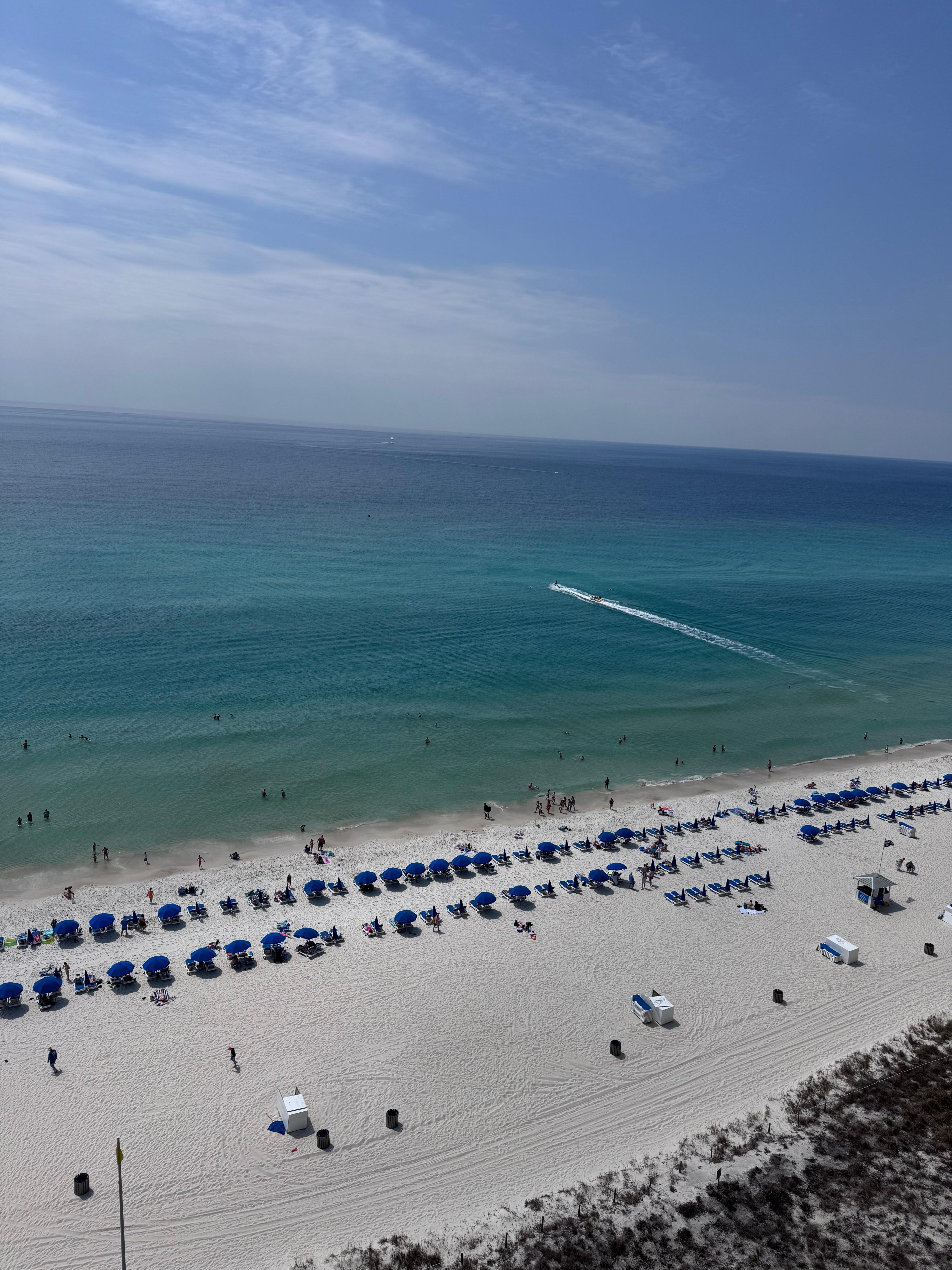 Pero llegaremos a eso. Hablemos de la playa. Estamos hablando de una playa que tiene más de 1000 pies de ancho. Eso es como un quinto de una milla de arena blanca azucarada que es todo tuyo. Sólo una vista increíble. Y puedes verlo desde el suelo y desde tu balcón privado. ¡Porque esta unidad está frente a la playa! Así que obtienes las mejores vistas, la mejor playa, el mejor lugar para una escapada aquí en Emerald Beach.