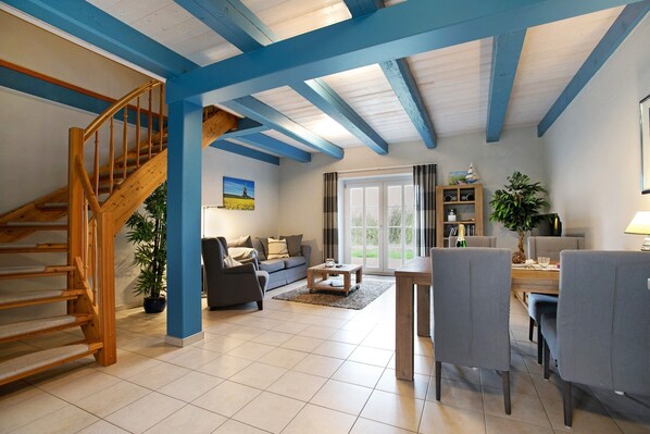 En el apartamento "Seegarden" disfrutaréis de unas vistas amplias a los prados y campos de Pellworm. A lo lejos se ven el molino Nordermühle y el faro. En la planta baja os esperan un salón-comedor moderno y un aseo de invitados. La cocina nueva y totalmente equipada tiene todo lo necesario para una estancia confortable. Arriba encontraréis el baño moderno con bañera, amplia ducha y aseo independiente. El dormitorio cuenta con una cama doble grande. En 85 m² hay espacio para hasta tres personas; para la tercera hay un colchón inflable o una cama supletoria en el salón. Para niños se puede preparar una cuna o cama adicional. Toda la casa tiene suelo radiante. La terraza privada y el jardín comunitario os invitan a relajaros.
