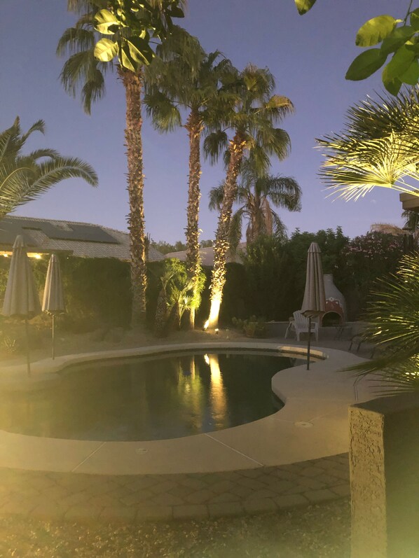 isla con encimera de granito y también tiene una chimenea al aire libre (el propietario proporciona algo de leña). TODAS las propiedades vecinas son casas de un solo piso, por lo que este patio trasero es muy privado y hace que sea fácil disfrutar del sol de Arizona durante el día y los cielos estrellados por la noche.