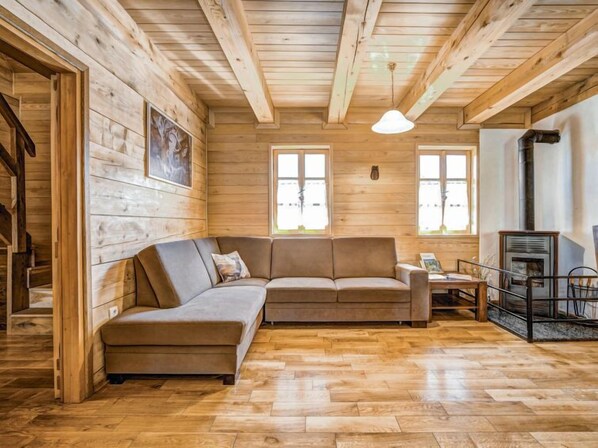 Chalet de madera 3 estancias 62 m2 en 2 plantas, orientación norte. Salón-comedor 22 m2 con TV (pantalla plana), estufa de lena y aire acondicionado. Cocina abierta (horno, 4 placas de vitrocerámica, congelador). Ducha/WC. Calefacción de leña. Buhardilla: entrada con aire acondicionado. 1 dorm., abuhardillado altura de techo 120 - 250 cm con 1 cama doble (2 x 90 cm, 200 cm de longitud). 1 dorm., abuhardillado altura de techo 120 - 250 cm con 1 cama de matrimonio (160 cm, 200 cm de longitud). El alojamiento dispone de: leña (gratis). Internet (Wifi, gratis). UP/I-335-02/16-01/25; 2125-08/1-16-5; 25/16