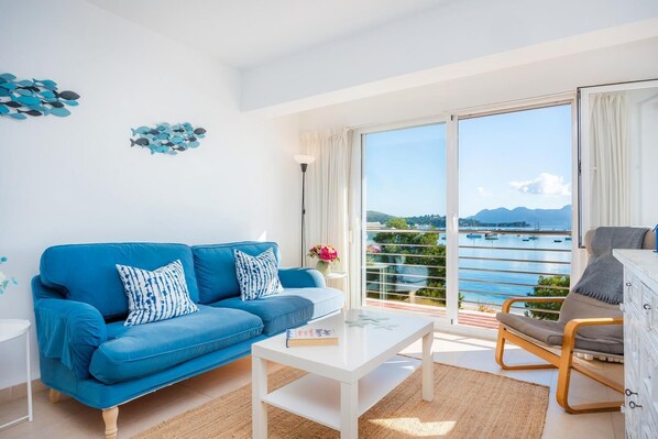Die Aussicht direkt auf die Buch von Pollensa. Super zum Frühstücken bei Sonnenaufgang. Allerdings ist der Balkon eher für 2 Personen gemacht, als für 4 Personen. Das Wohnzimmer ist für 4 Personen ausreichend.