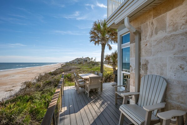 Quítate las chanclas y disfruta de la playa las 24 horas, los 7 días de la semana. Nuestra hermosa casa recientemente renovada de varios niveles se encuentra directamente en la playa ... donde su patio trasero es tan grande como el océano y puede surfear, cazar conchas, pescar y nadar todo el día. Estamos ubicados en el lado de la playa de A1A a solo 4 millas al norte de St. El puente norte de Agustín. Nuestra casa ofrece mucho espacio para extenderse, tanto por dentro como por fuera. Incluye 4 master suites con grandes televisores de pantalla plana, y 1 habitación con 2 juegos de literas, sofá cama de tamaño completo y sala de televisión con X-box ... la habitación de los sueños de un niño se hace realidad. Disfrute de un día cálido y soleado descansando en cualquiera de nuestros 2 balcones, elija, ambos tienen hermosas vistas panorámicas del océano. Disfrute cocinando en nuestra gran cocina totalmente equipada con isla, rincón de desayuno y amplio comedor, junto con una sala de estar contigua con un gran televisor de pantalla plana, nuevamente con todas las habitaciones con hermosas vistas panorámicas de la costa. También puede disfrutar de asar sus comidas favoritas en la parrilla ubicada en una de nuestras cubiertas junto con una mesa al aire libre con 6 sillas y muchos otros asientos para todos mientras disfruta de su comida, tomando el cálido sol y las increíbles vistas al océano.