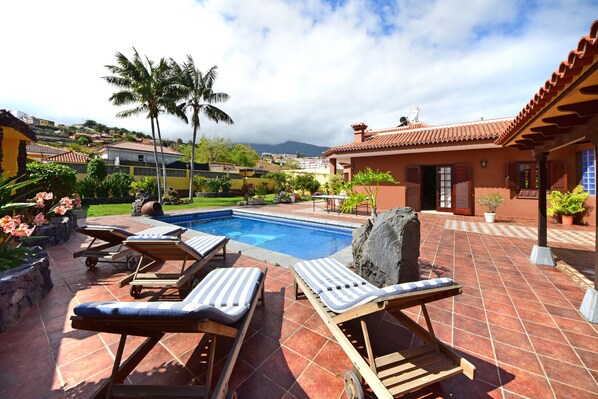 Esta cómoda casa de alquiler vacacional en las Islas Canarias ofrece 249 m2 de espacio habitable. Su diseño único permite una amplia entrada de luz natural en todo el lugar. En el centro de la casa, hay un encantador "patio" alrededor del cual se distribuyen todas las habitaciones. La cocina está totalmente equipada con todo lo necesario para cocinar. Además, hay una cocina al aire libre ubicada junto a la amplia zona de barbacoa, la piscina privada (4 x 8 metros) y el jardín, que abarca un área total de 1800 m2. También se dispone de un estacionamiento privado.