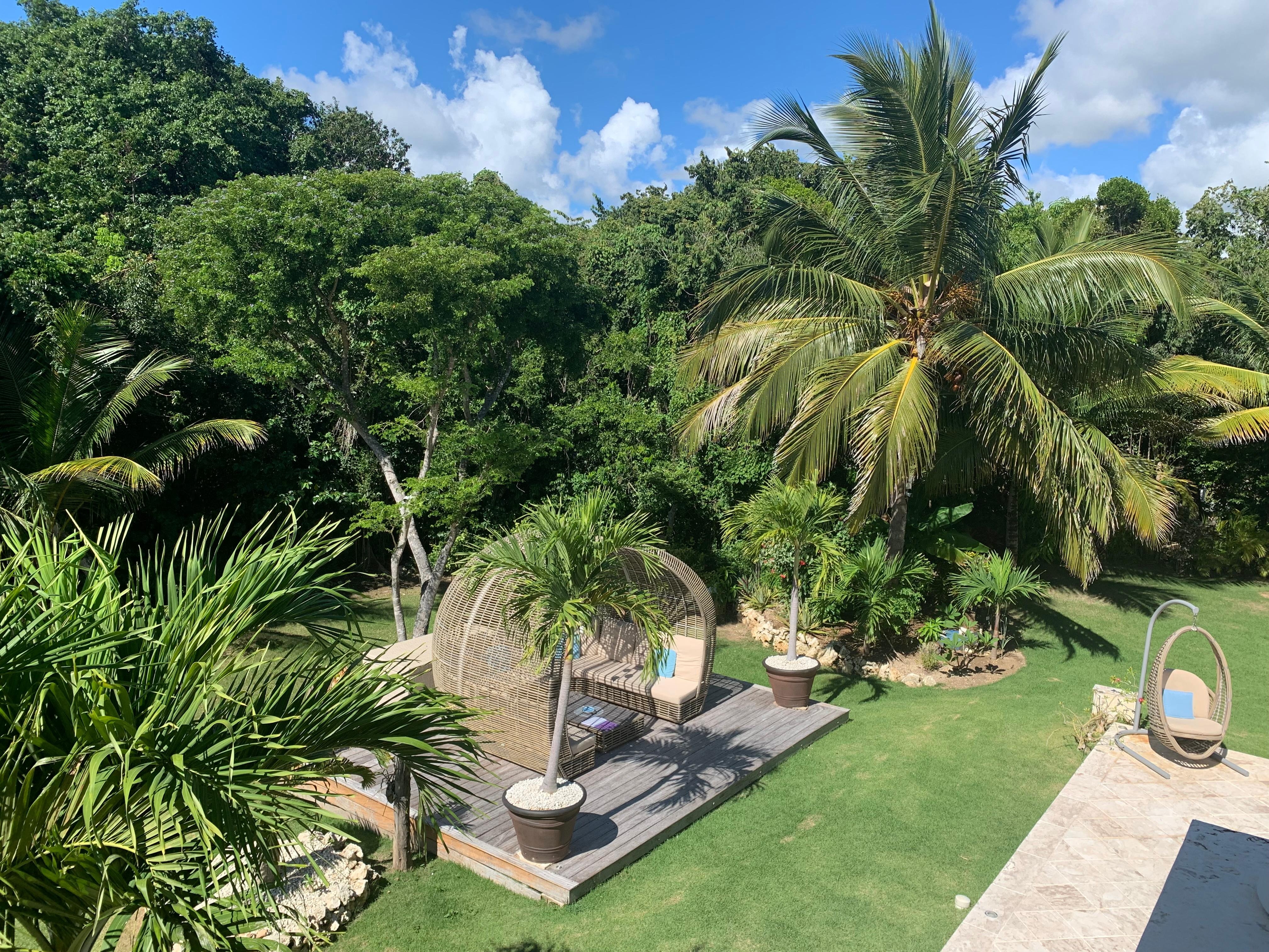 La propiedad está rodeada de vegetación exuberante y palmeras que le dan mucha privacidad. Un montón de espacio para que los niños corran y jueguen.