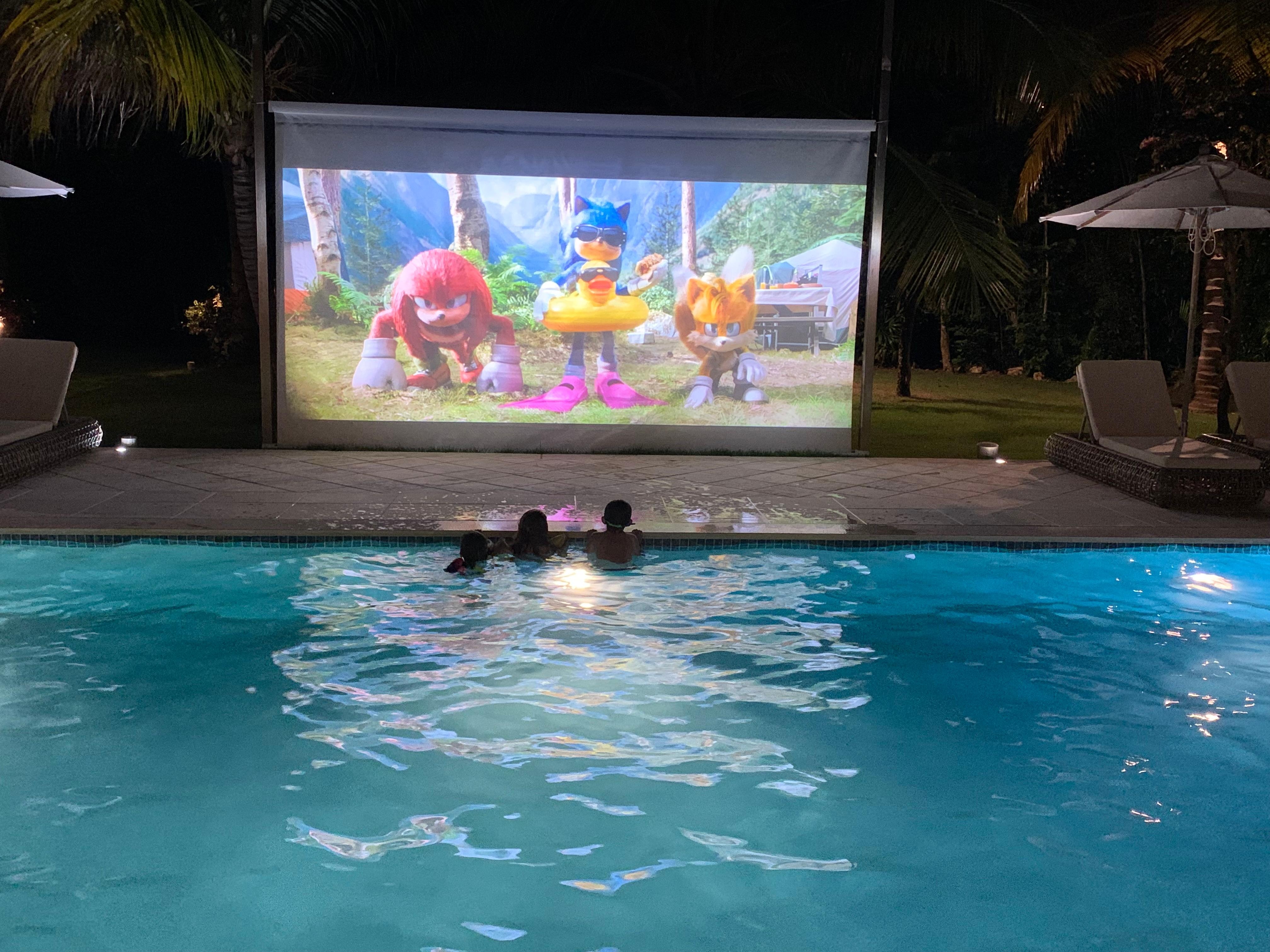 Pantalla de cine exterior y sistema de sonido. La pantalla se puede ver desde la piscina, la terraza inferior y la terraza superior.