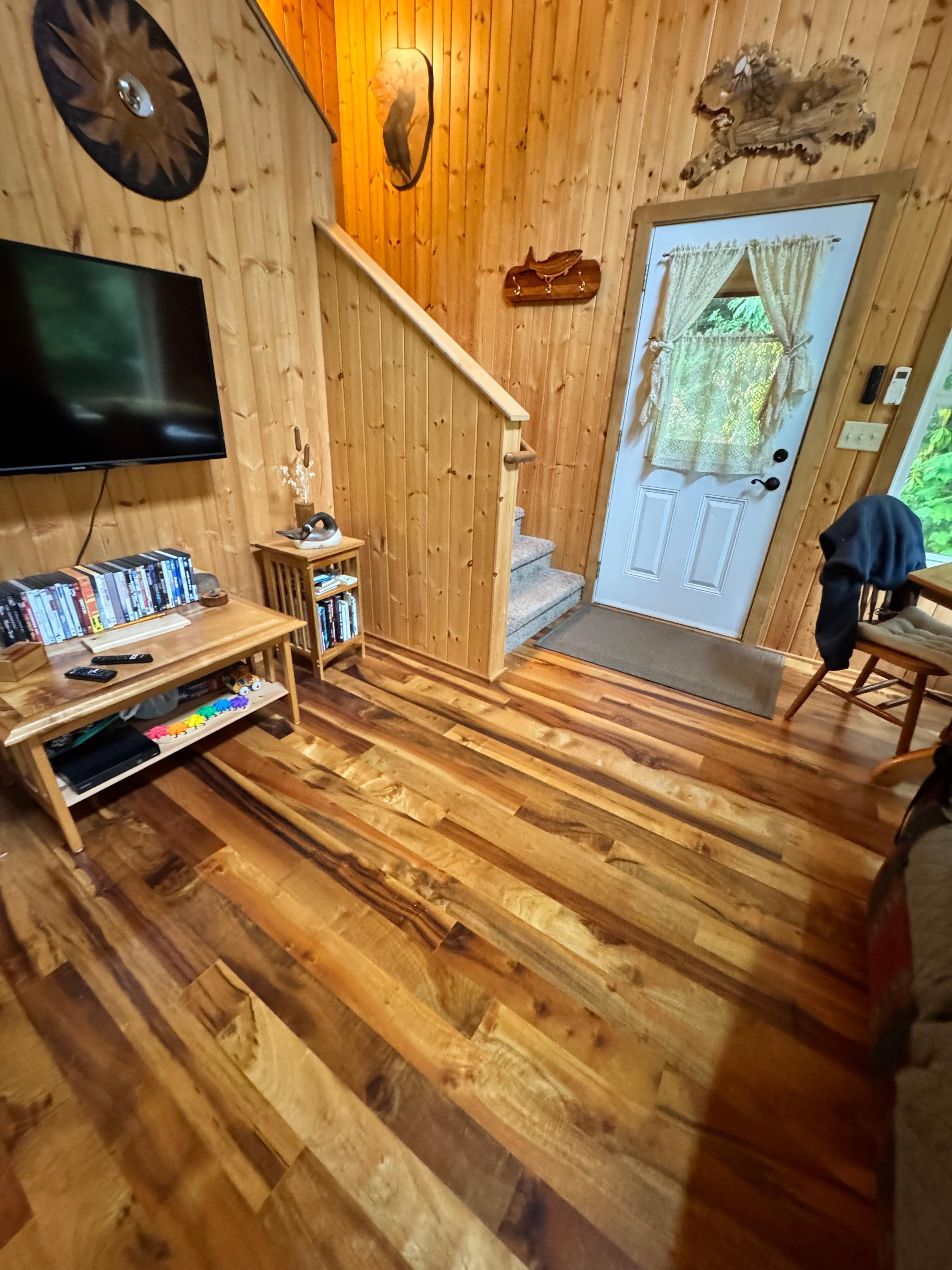 Tiene un hermoso piso de Myrtlewood en el nivel principal y una alfombra nueva en el dormitorio del loft.