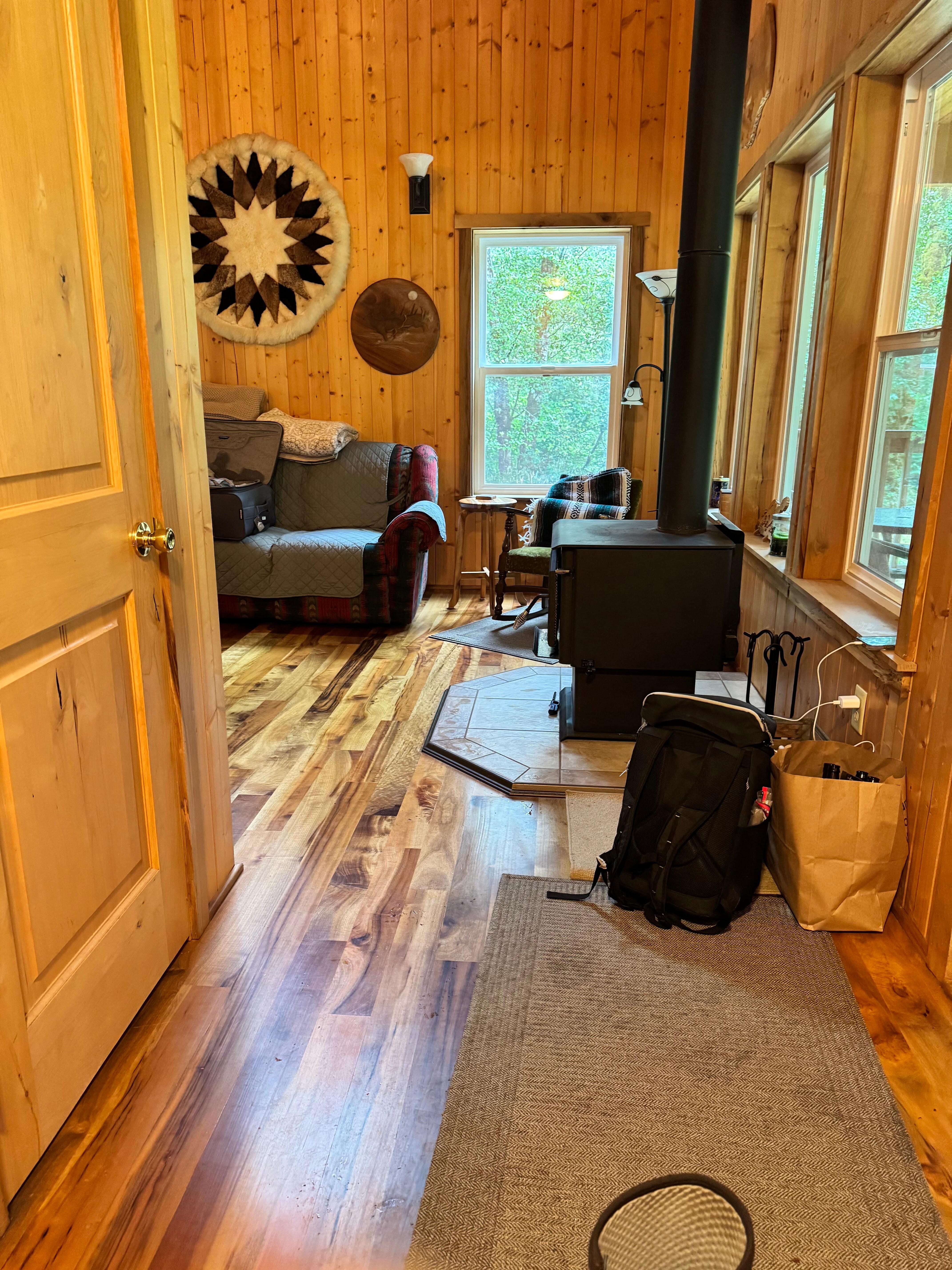 La cabina cuenta con paneles de pino en toda la casa, un techo alto y abierto en la sala de estar y los muebles, y una decoración de vida silvestre boscosa de la Galería Myrtlewood para darle una verdadera sensación del noroeste.