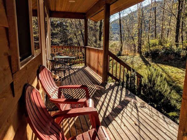 La cabina tiene lavadora y secadora y una parrilla de carbón en el porche trasero.