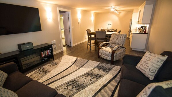Cuenta con una sala de estar, cocina y comedor de concepto abierto con nuevos muebles de lujo. Disfruta de una noche de cine con una televisión inteligente de pantalla plana, completa con Netflix, reproductor de DVD y WiFi.