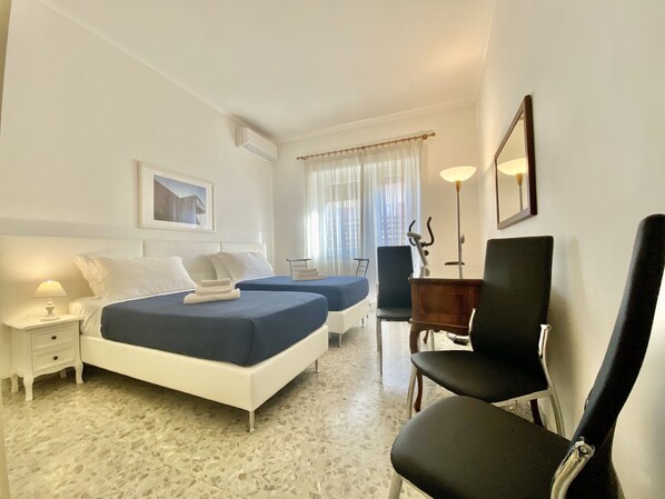 La habitación # 1 (la "City Room"), con sus muebles modernos, cuenta con dos camas individuales estilo hotel (190 cm x 90 cm) que se pueden juntar para convertirse en una cama tamaño king (190 cm x 180 cm), También cuentan con una cuna y una cuna para bebés recién nacidos, que también es una caja, gratuita para los más pequeños y muy bienvenidos, hasta 15 kg y 1 mt. alta. En la "Habitación de la Ciudad" que hace que este alojamiento sea perfecto, también para trabajar.