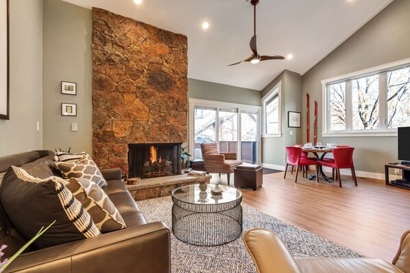 Un garaje para dos autos, un jacuzzi privado y una nueva chimenea brindan comodidad y lujo para que sus vacaciones de invierno sean memorables.