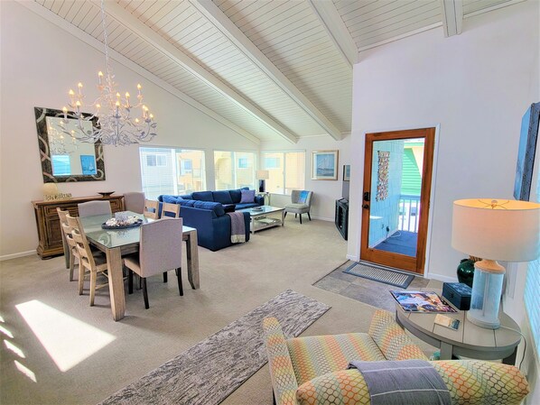 Disfruta de más de 1800 pies cuadrados de estilo de vida de playa con un plano de planta abierto perfecto para el entretenimiento y la espaciosa terraza con vista al mar en la azotea. Los altos techos abovedados de cedro con una lámpara de araña personalizada en una gran sala con mucha luz natural y vistas al océano desde grandes ventanales interiores crean un estilo de vida de playa en su máxima expresión. Todos los muebles nuevos y ropa de cama para su comodidad. Relájese mientras escucha y puede observar las olas del océano desde su hogar en la playa durante su estadía.
