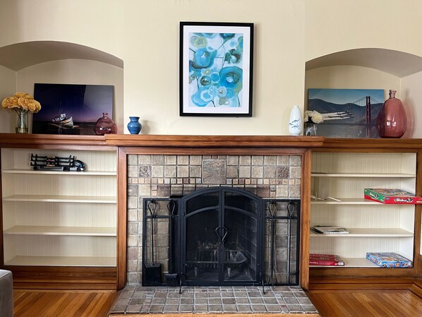 * Hay un gran sofá en la sección de sala de estar con chimenea de leña con encanto original.