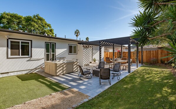 El área del patio trasero cuenta con una mesa de fuego de gas y un gran spa para 5-6 personas. El espacio está rodeado por un exuberante follaje tropical que brinda privacidad y abundante vida de las aves. El espacio frontal está anclado por un enorme árbol de jacarandá todo encerrado por la cerca de privacidad / seguridad.