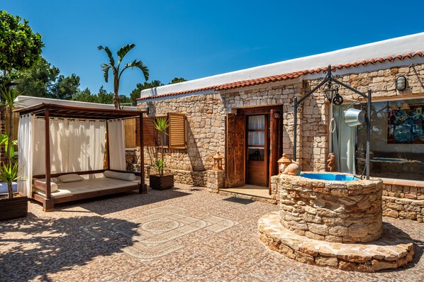En el exterior, encontrarás un jardín cuidadosamente mantenido, una piscina privada perfecta para refrescarse en los días más calurosos y una zona de barbacoa para disfrutar de cenas al aire libre bajo el cielo estrellado de Ibiza.