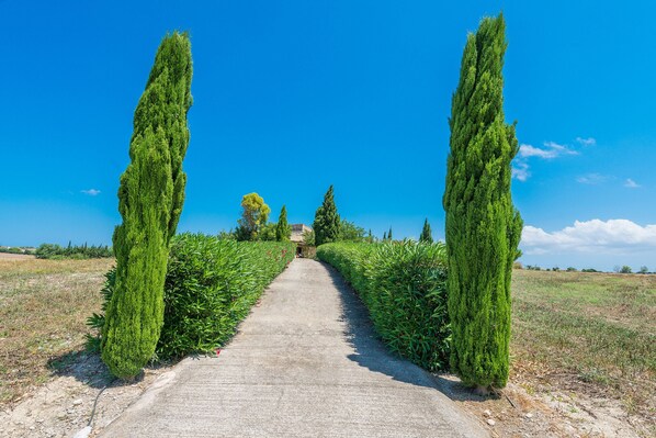 Un idílico sendero arbolado guía a los visitantes hacia la casa, que se encuentra rodeada por un exuberante jardín salpicado de vegetación y zonas de estar y comedor al aire libre, ideales para disfrutar de momentos frescos en buena compañía.