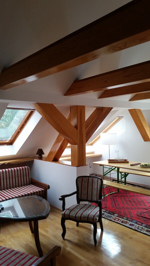 El ático tiene una decoración moderna con suelo de parqué y una cocina totalmente equipada, Internet WIFI, TV LCD por cable, aire acondicionado, calefacción de gas y un rincón de la oficina en casa. Situado en un tranquilo patio en el corazón de Sarajevo, con aparcamiento vigilado (10 € / día), terraza común, en una casa de familia de más edad (arquitectura yugoslavo-judía) en el que sólo viven seis familias.