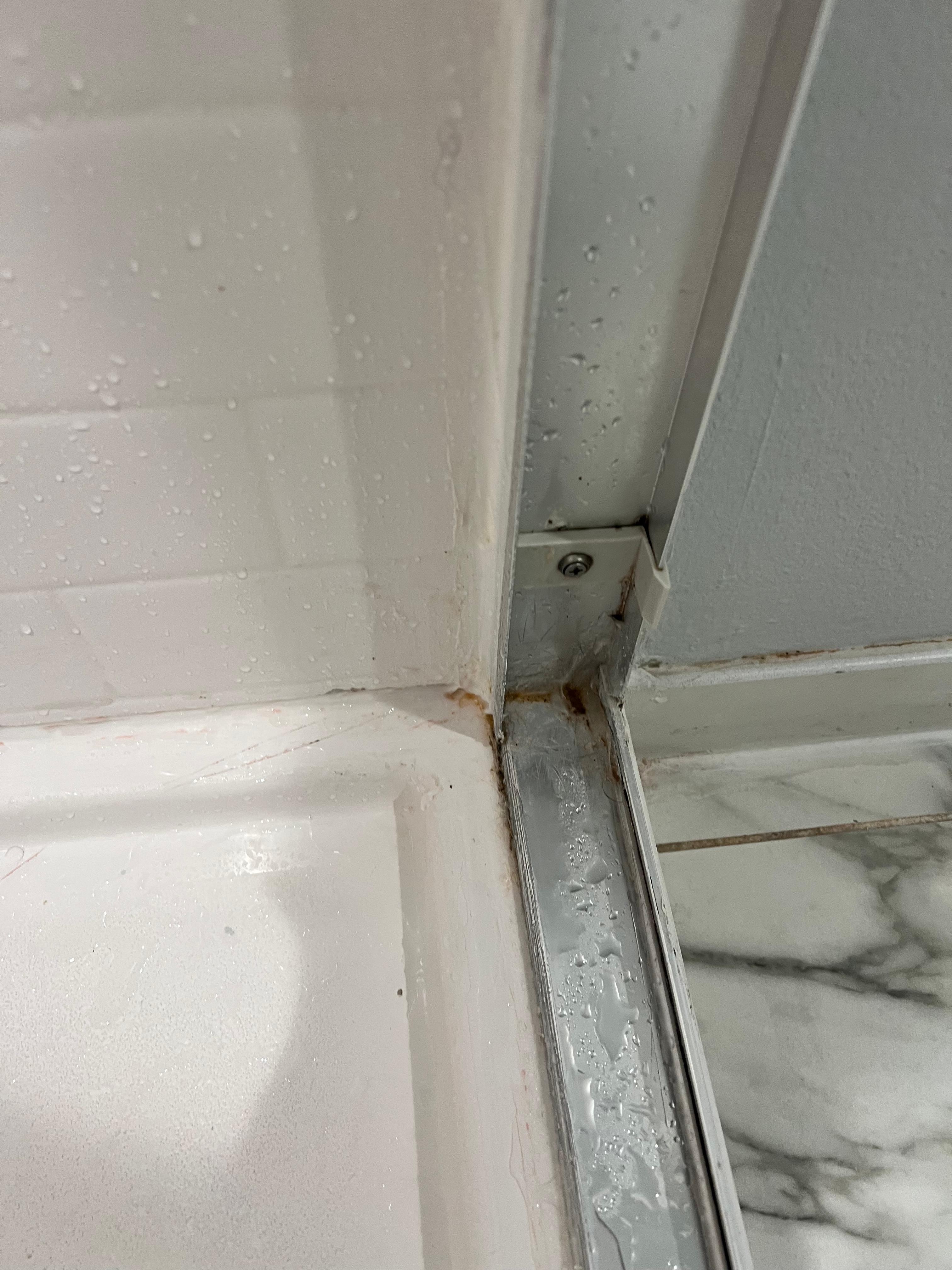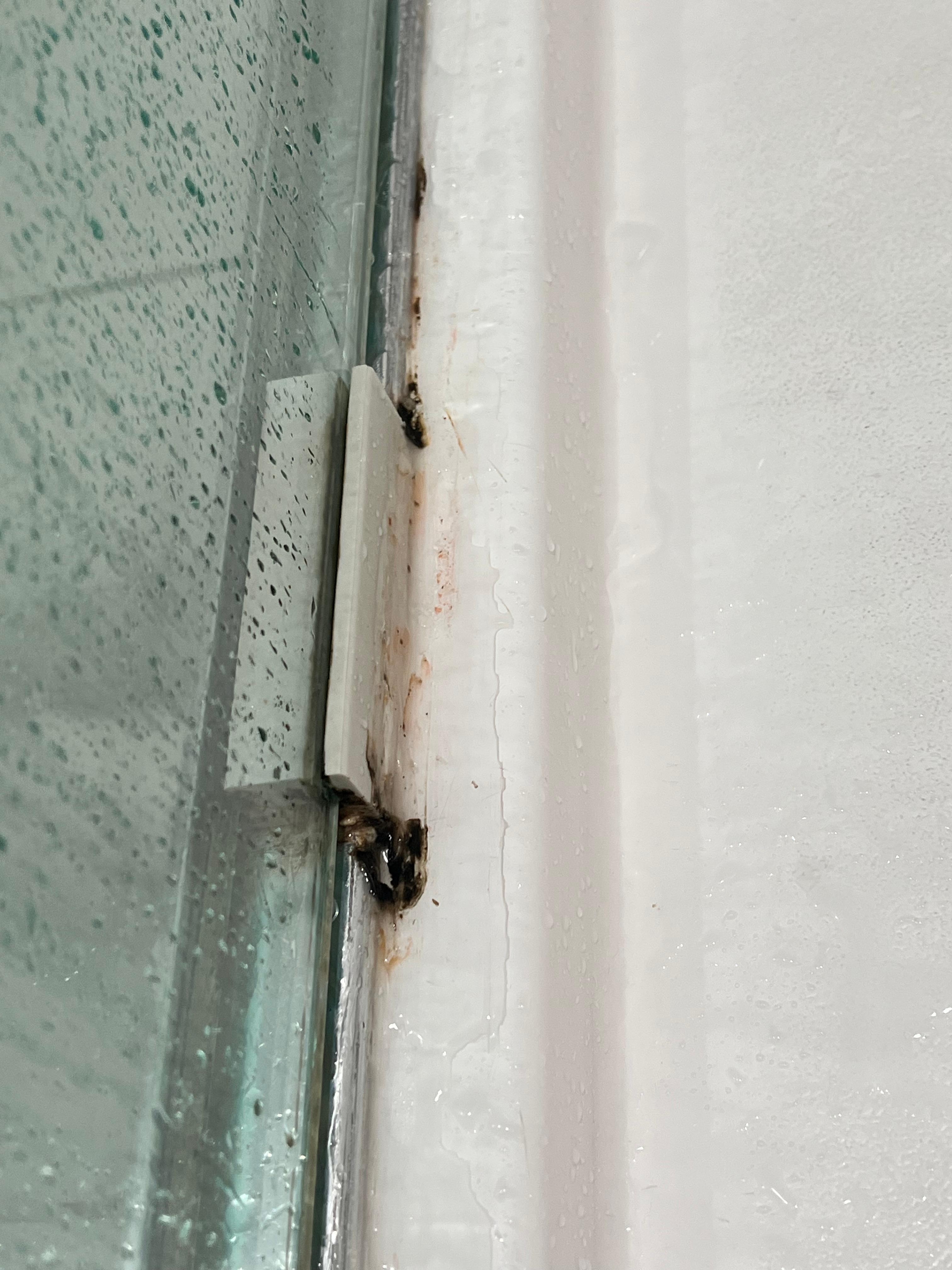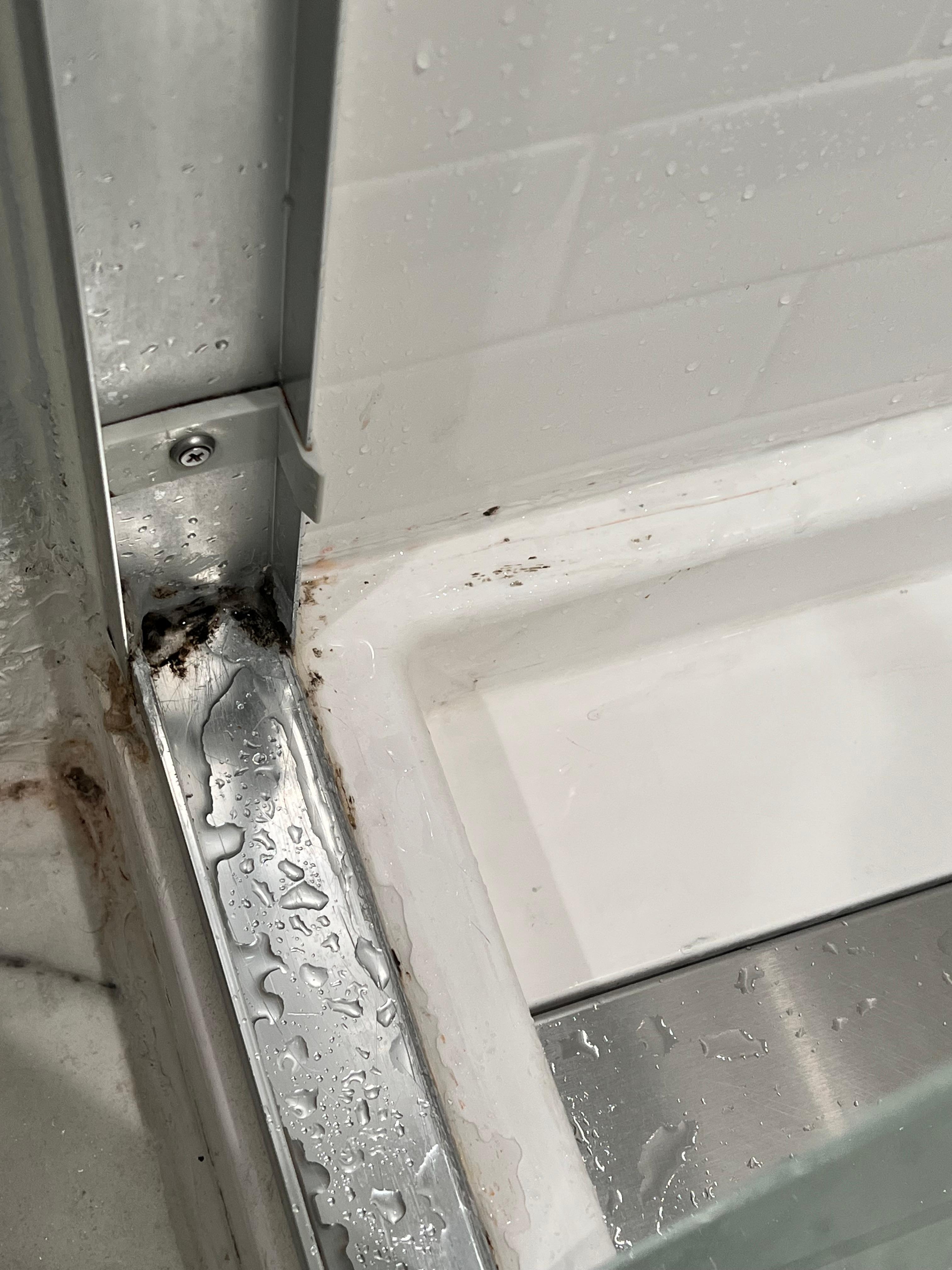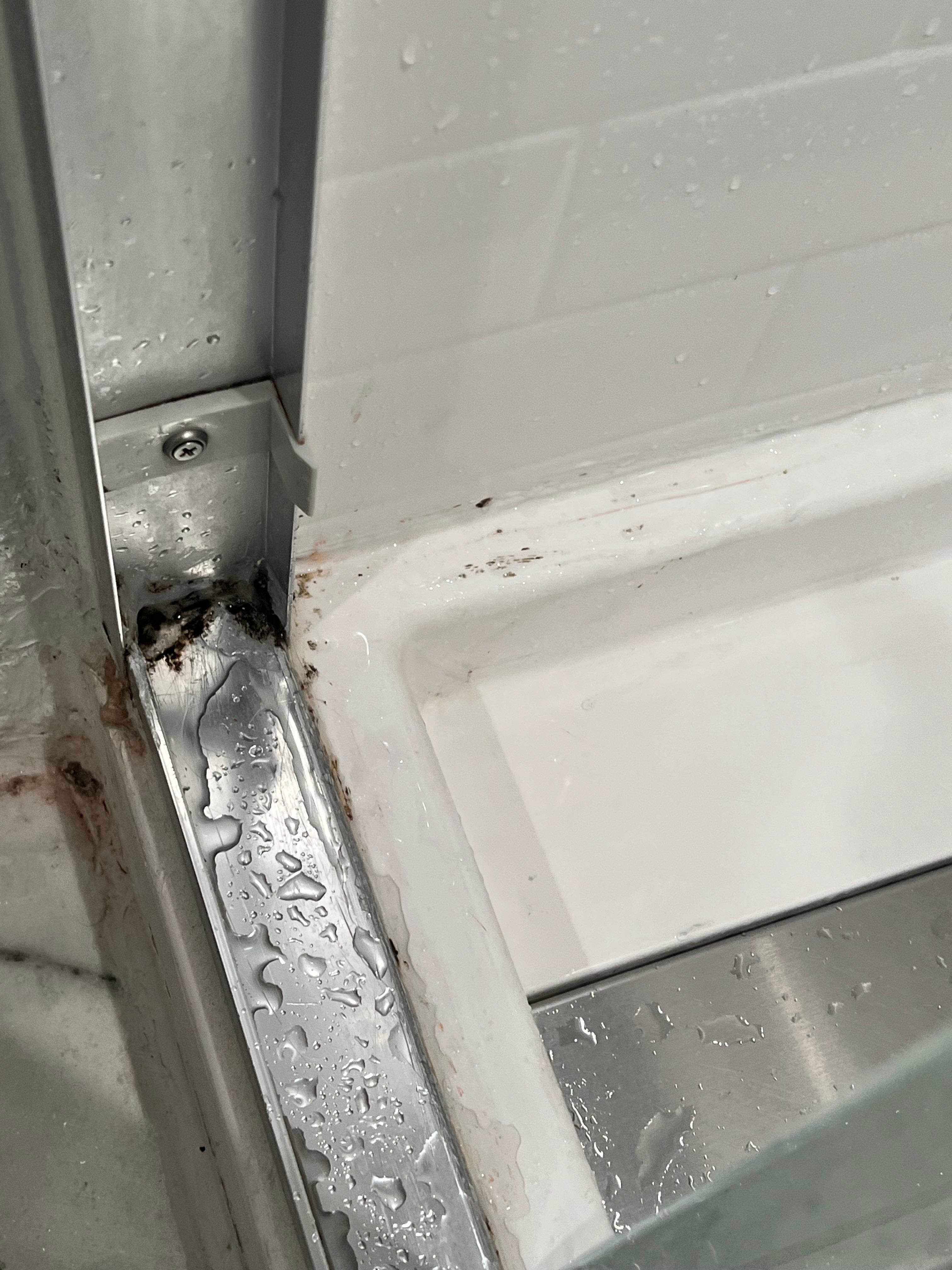 The bathroom shower was dirty and had black mold