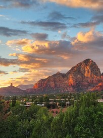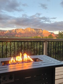 This place is stunning starting with the floor to ceiling panoramic views of Sedona's most iconic red rocks. Very clean, incredibly well stocked kitchen, wrap-around deck, outdoor fire table, barrel chairs right next to windows. Open floor plan makes sure no one is left out of conversations during meal time prep. Two bedrooms on ground floor and up two short flights of stairs to living room, kitchen, master bedroom and bathroom with 2-person jetted tub. Very incredible stained glass window over master tub and stained glass door to deck. So much beautiful artwork throughout the space...very unusual for a rental. Needed propane for fire table and was delivered and installed in less than 30 min. Asked for extra blankets and got them right away. Huge TV in living room but we spent all our home time on the deck marvelling at the view, sunrises, sunsets, and stars. By far the best vacation rental of our 20 rentals in US and Europe. Look no further, you will not find a better one.