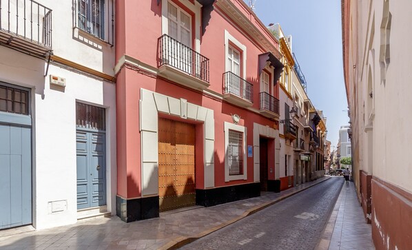 The one bedroom flat at ground level opens onto the courtyard and is the smallest of 5 flats in this beautifully converted Palacio. The two third floor rooftop terraces, one shaded, one sunny are shared with other residents as is the laundry room. Coming in to the Palacio off the street, brings you into an oasis of calm and it's several degrees cooler inside. Despite an exceptionally hot April with afternoon temperatures of 37⁰ we didn't need to use the aircon. We took our breakfasts up to the Bougainvillea shaded table on the roof, until the lift stopped working. I think the larger flats are ritzier but we were completely comfortable. Good quality linen and towels and decent complimentary toiletries. The location is perfect for walking to all the historic attractions and there are shops and restaurants within 5 minutes. The management company was perfectly friendly and kindly allowed us to keep the key after we had vacated the flat, in order to leave our bags in the building until a late flight home. Communication with the company was a bit haphasard and we had to pay a hefty supplement in cash due to a late arrival time. It would actually have been cheaper to stay overnight at a modest hotel on the first night due to our late (and delayed) flight.
