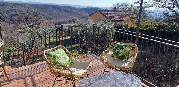 Se accede a la cabaña de arriba a través de una escalera de dos rampas, al final de la cual se abre una encantadora terraza cubierta por un techo de madera, equipada con sillones de mimbre y una mesa para comer al aire libre, con una maravillosa vista de todo el valle, que en días claros llega al mar.