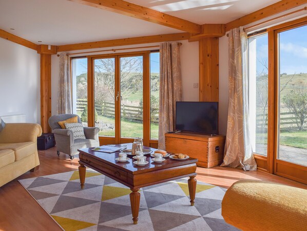 Sala de estar / comedor: con 42 "Freesat Smart TV con Netflix, reproductor de DVD, altavoz bluetooth, vigas y 3 juegos de puertas que dan al jardín.