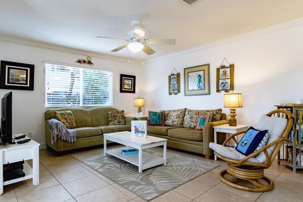 Hay un Smart TV de 48 pulgadas con cable básico y Netflix en la sala de estar. Los dos televisores de arriba tienen Roku con varios servicios de transmisión gratuitos. También hay un reproductor de Blu-Ray y una selección de DVD junto con algunos libros y juegos.