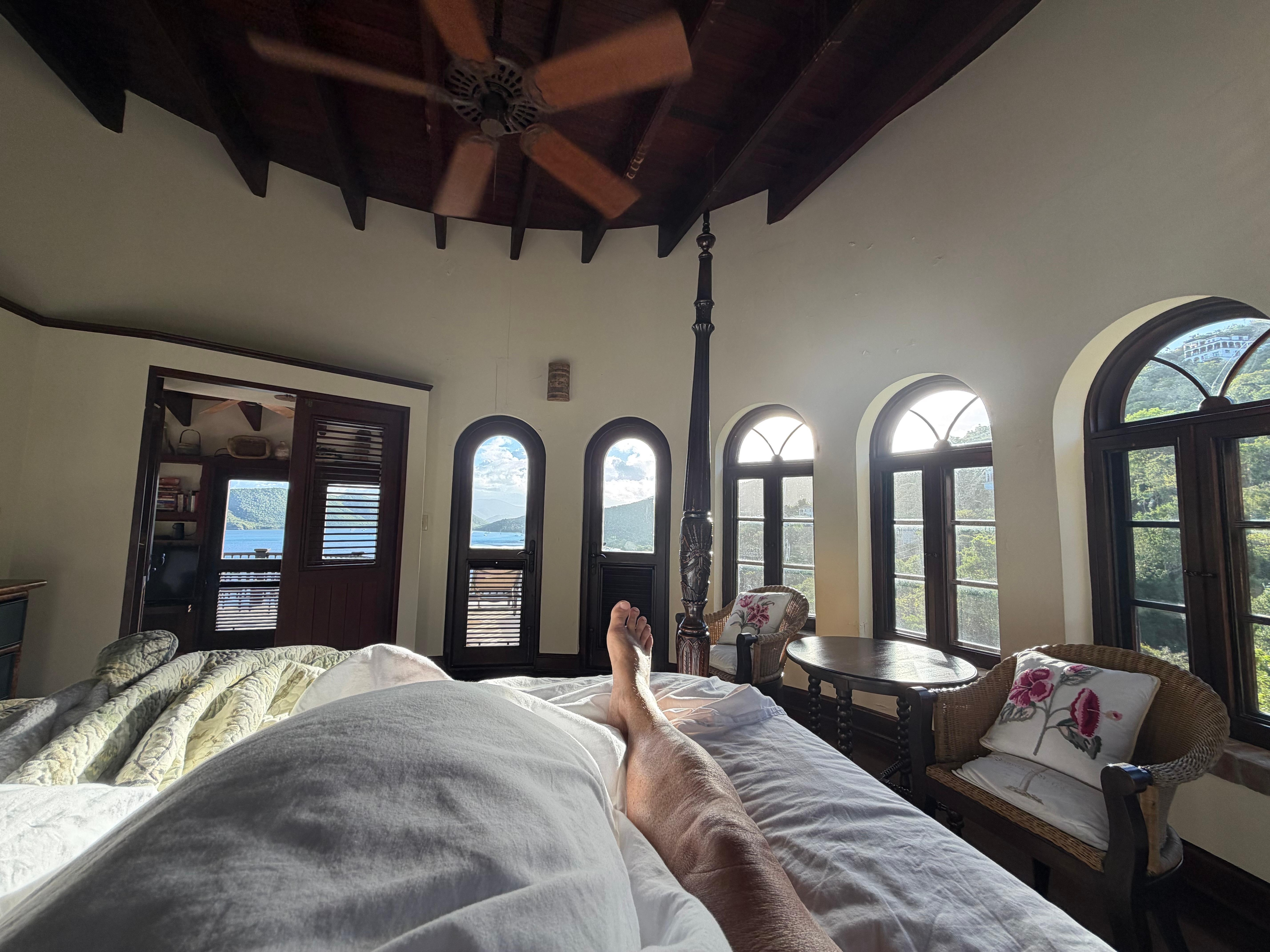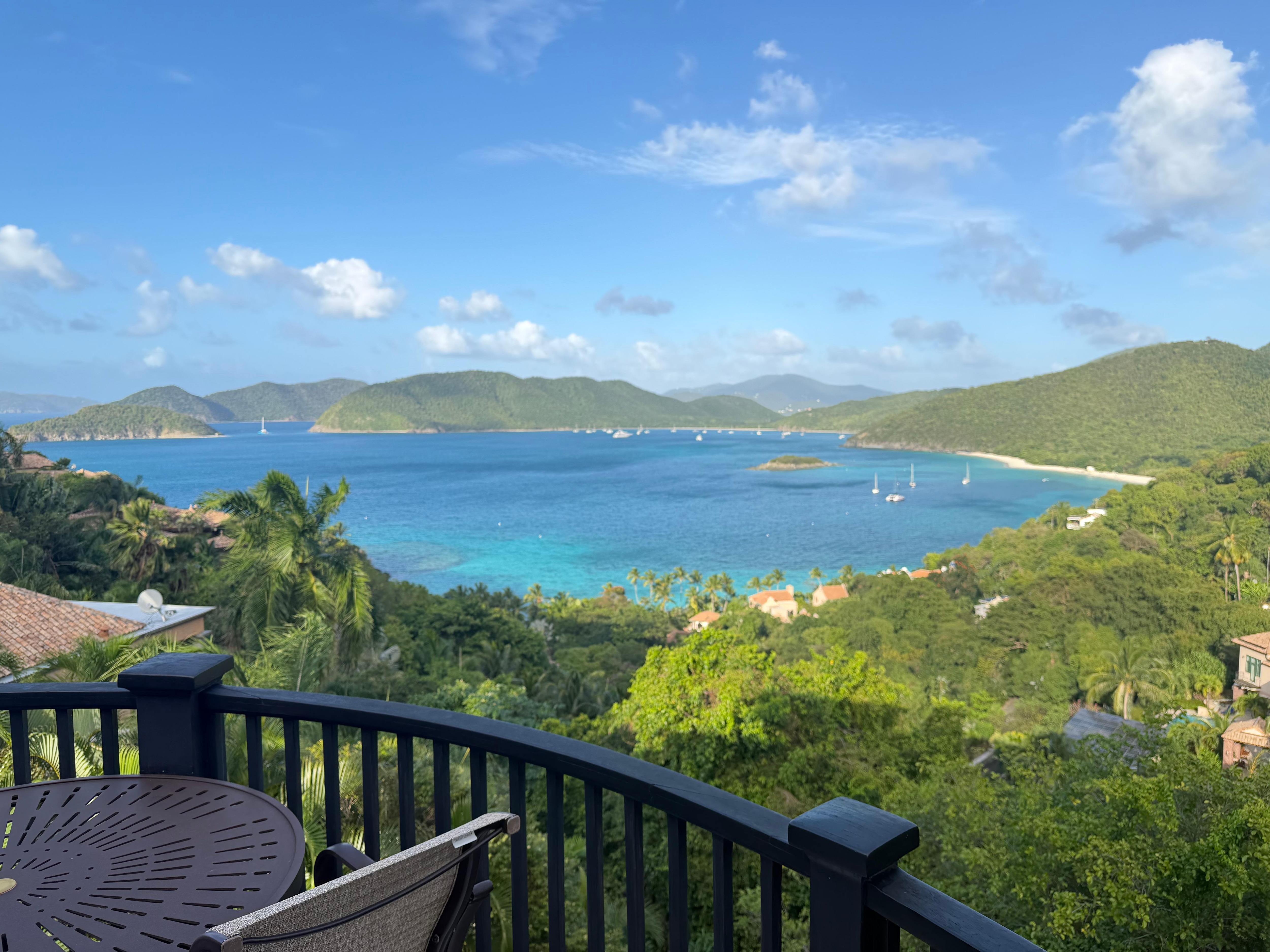La vista al mar balcón de la suite del ático tiene una bañera de hidromasaje privada con magníficas vistas a las hermosas islas de los EEUU y Vírgenes Británicas. Por la noche, las estrellas del cielo costa norte brillan más brillante, y las luces relucientes de Jost Van Dyke, y Tortola en la distancia definen romance en el Caribe.