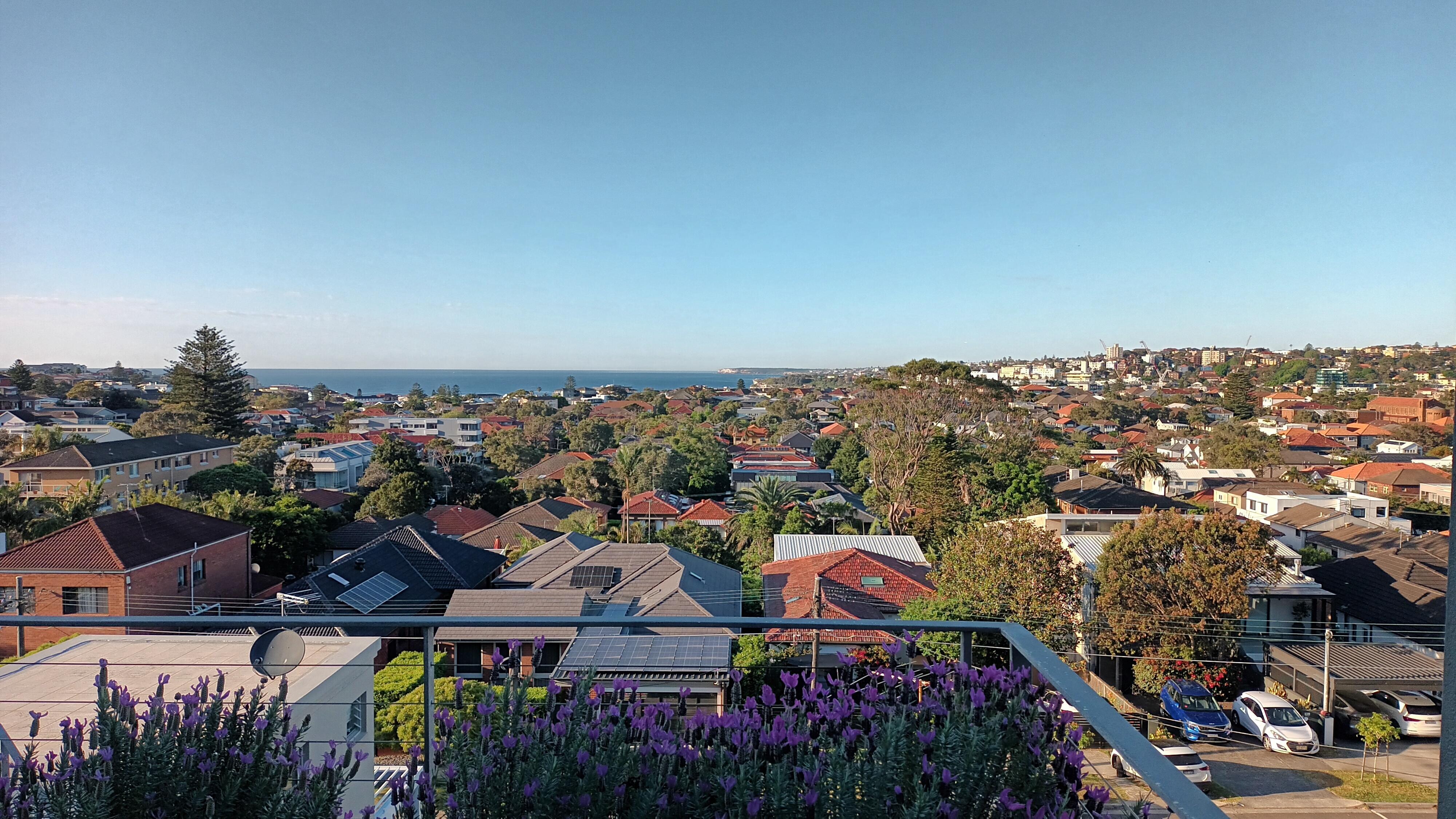 Nuestras vistas son espectaculares y, aunque no tiene vistas desde su estudio, al llegar al estudio, tenemos impresionantes, increíbles vistas de 270 grados de Bondi Beach y más, todo el camino hasta la ciudad. Desde su estudio, no mira a una masa de otras propiedades y pisos. Estás rodeado de vegetación lujosa alrededor de tu patio.