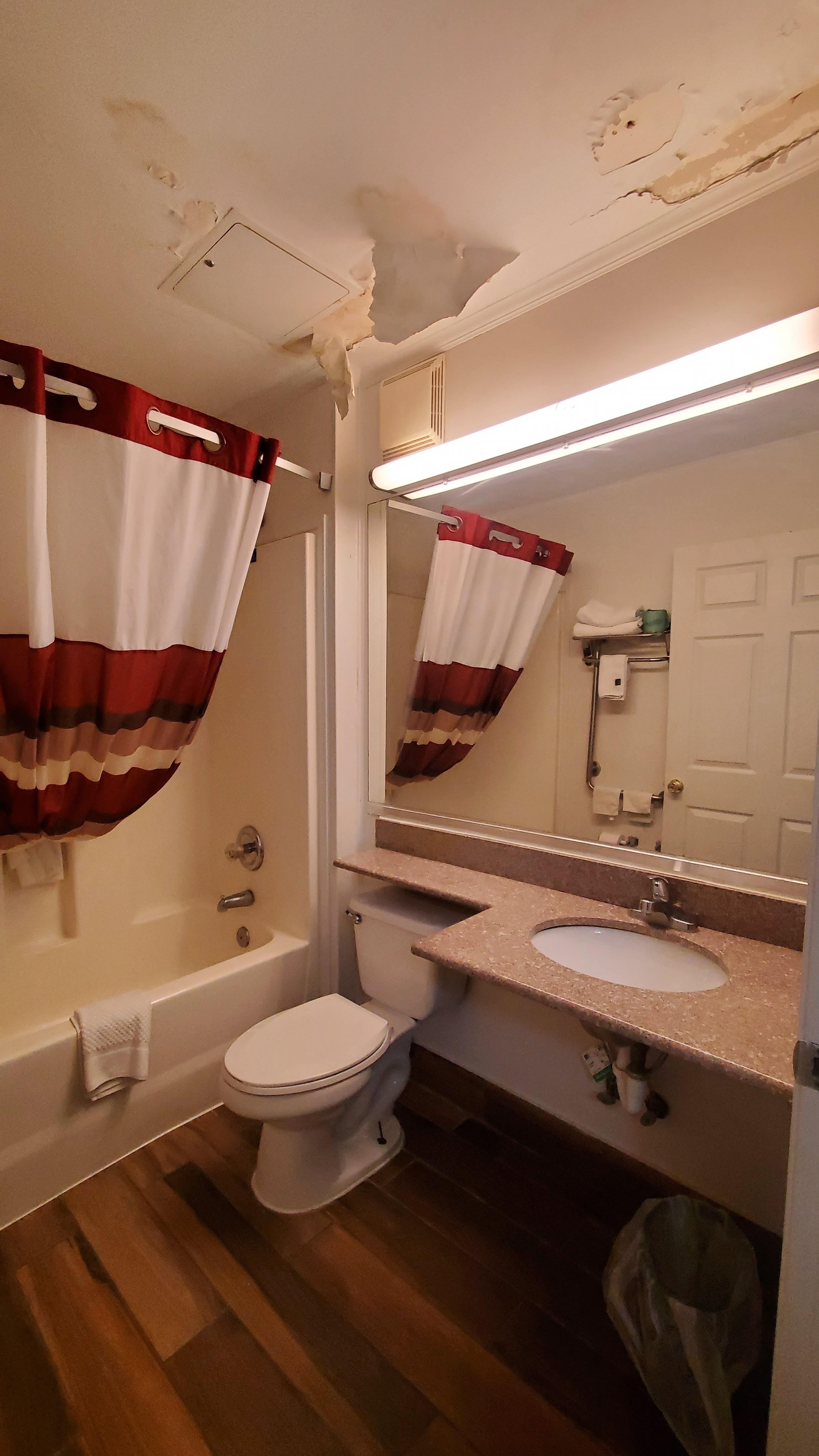 Overall it felt unsafe to stay in the building. They have signs that they are undergoing renovation but outside of seeing things that need to be addressed (e.g., bathroom ceiling caving in, visible water damage, walls that need patching, items falling off of the wall, mechanical items in what should be the breakfast area) we did not see any active renovation. Overall, the building didn't feel, appear or smell clean. We purchased towels and pillows from a nearby Walmart to take a shower and sleep. The smell was a combination of a pet store, smoke and dryer sheets.