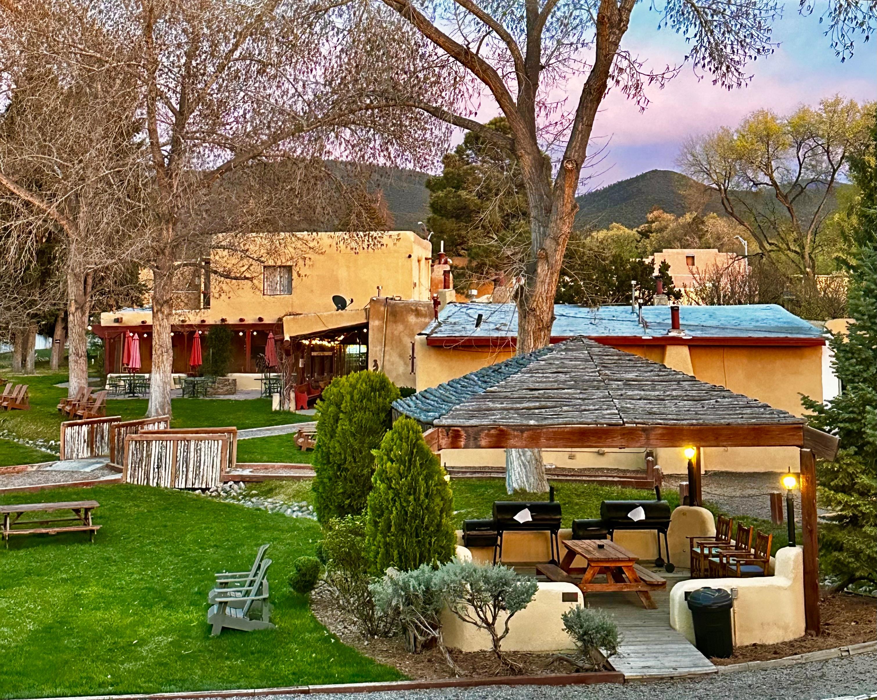 I brought an 80 pound dog-- the beautiful grounds allowed so many places to walk, and there were stations with bags and areas just for the dogs to take care of their business. The room was large, with a real wood fireplace, a large tile kitchen area with plenty of space, even barstools for sitting. There was a nice table and chair area outside the room just for me, and a back patio with a sliding glass door and outdoor seating in the back. When I checked in, there were warm cookies and a hot nacho bar. The breakfast is the best I've had anywhere, and I am well travelled. It was a traditional New Mexico breakfast, everything homemade, scrambled eggs, potatoes, roast peppers and onions, green chile, beans, even tamales. I a vegetarian, so I don't remember if there was meat--more than likely there was, but if not, who could miss it? The food was served from those steaming silver service sets caterers use. There were ceramic plates, nice silverware, and plenty of hot coffee with tea options. To think this was included! If you are passing through Taos for the night, and you want the authentic New Mexico experience, stay here!
