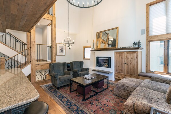 La espaciosa sala cuenta con grandes ventanales de piso a techo, una chimenea de gas natural, TV de pantalla plana y un plano de planta de concepto abierto para la cocina grande y bien equipada. La cocina cuenta con electrodomésticos de primera línea, una nevera de gran tamaño con 2 cajones refrigeradores adicionales integrados en los gabinetes, y mucho espacio en el mostrador para albergar y cocinar comidas grandes. Hay un baño y medio de la gran sala. ¡Un área de oficina elevada y Wi-Fi privado para el condominio son una ventaja adicional y le permiten mantenerse conectado mientras disfruta de su escapada a la montaña! También se incluyen 2 plazas de aparcamiento privado en el garaje subterráneo.