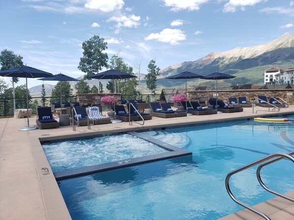 Diversión junto a las pistas de ski, con alberca al aire libre y una tina de hidromasaje