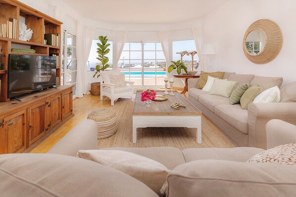 The serene villa is tastefully decorated in shades of white and natural wood tones. The comfortable and bright living and dining areas open to the terrace, pool and sea views.