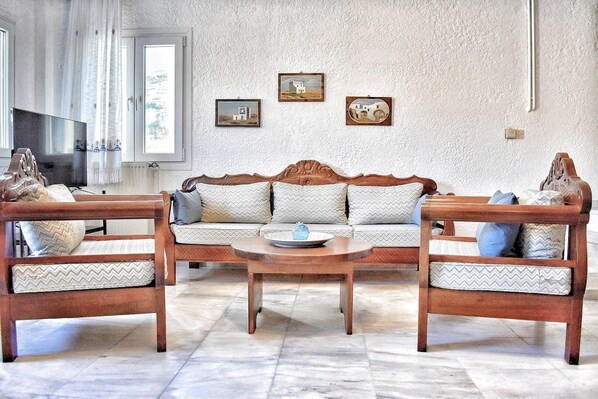 El gran salón de la villa tiene un cómodo rincón de estar con sofá rústico, una chimenea de mármol en caso de que visite la villa en invierno y está decorado con pinturas locales y objetos de arte. Un paseo en la ducha sirve la sala de estar.
