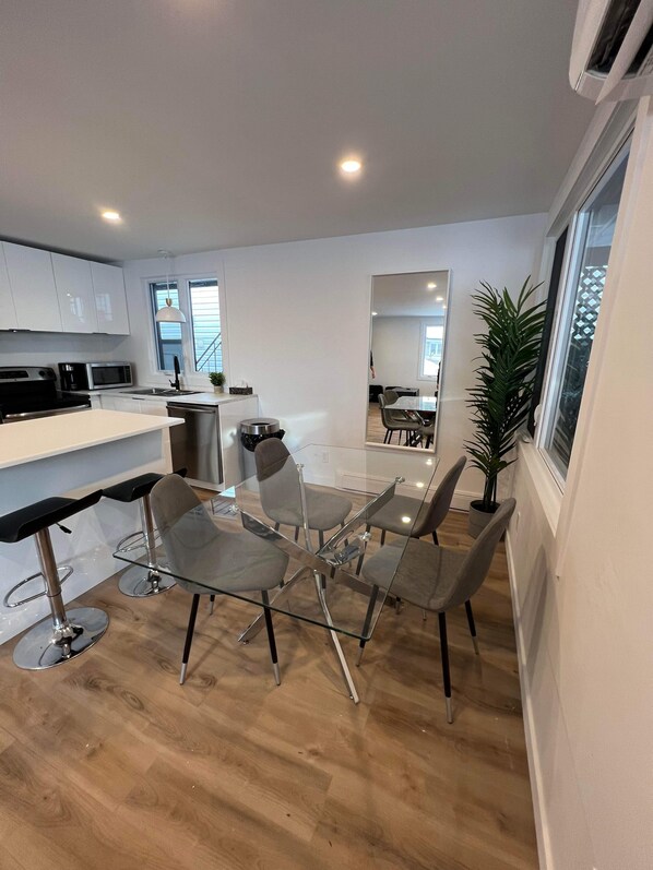 L’appartement aurait besoin d’un coup de peinture en général. Les salle de bains et les lits étaient propre et la cuisine. Convenable en général mais le divan n’est pas full confortable dans le salon du haut!