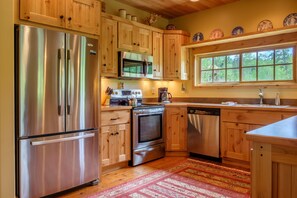 COCINA: esta es una excelente cocina para una multitud, ya que se abre al bar, el comedor y la sala de estar. Está equipado con todos los electrodomésticos de acero inoxidable, un rango eléctrico superior liso, toneladas de servicio y artículos para picnic, y muchos extras de electrodomésticos pequeños como una olla eléctrica, una batidora eléctrica y una licuadora.