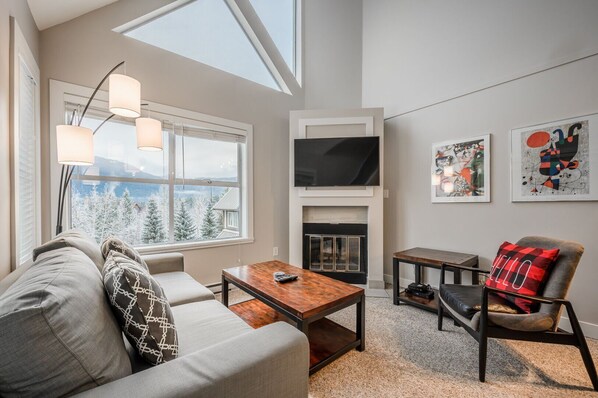 Esta unidad tiene un plan de vida abierto con techos altos abovedados con un ventilador de techo. La sala de estar cuenta con una chimenea de gas, cómodos asientos con TV, DVD, CD / equipo de música con cinta adhesiva, ventanas grandes y un balcón con vistas aisladas de las montañas hacia el oeste hacia Sproat y Rainbow Mtn.