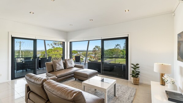 La ubicación de la unidad en la colina del faro le da vistas al río, el interior y el océano. La cocina abierta, el comedor y la sala de estar tienen muebles de calidad complementados con pinturas originales. La cocina cuenta con electrodomésticos Miele y todo lo que necesita para cocinar una cena gourmet. Las puertas correderas conducen a un gran balcón cubierto con barbacoa, comedor al aire libre para seis y salones de mimbre para tomar una copa.