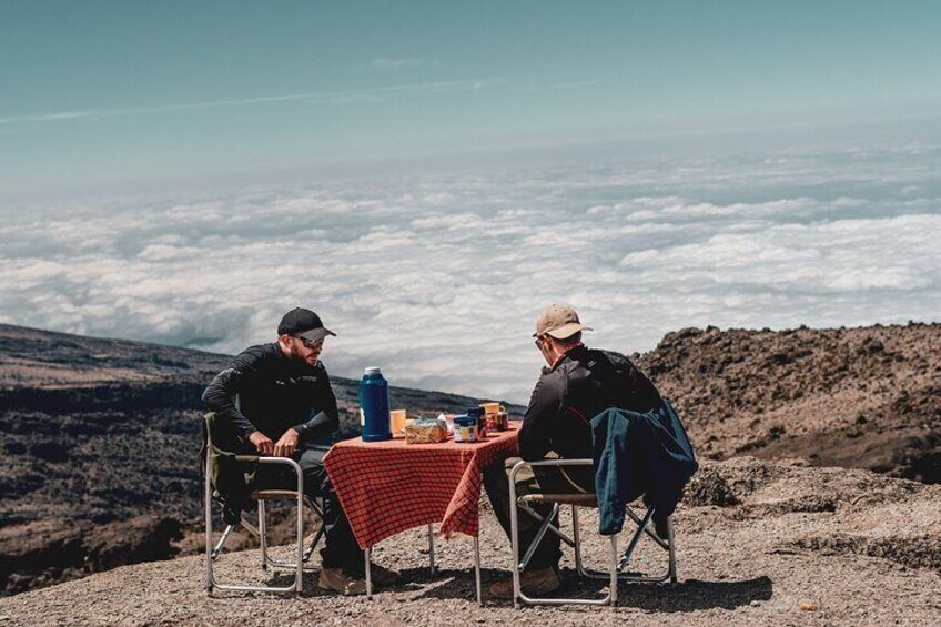 Mientras ascendemos, pasamos el último punto de riego y avanzamos hacia la silla del Kilimanjaro. Entre los picos de Mawenzi y Kibo, la vegetación está cambiando a una zona alpina desértica a 4000 metros. Este siete nuestro caminar será tomado a un ritmo lento, tenga cuidado con los primeros signos de mal de altura. Tomaremos nuestro descanso y cenaremos en la cabaña del Kibo, aquí nos preparamos para la subida a la cumbre. Elevación: 3700m/12,200ft a 4700m/15,500ft Distancia: 9km/5.5mi Tiempo de caminata: 5-6 horas Hábitat: Desierto alpino Comidas: Desayuno, almuerzo y cena