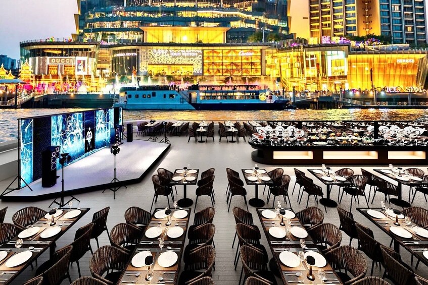 La noche cobra vida con actuaciones de danza tradicional tailandesa, el elegante espectáculo de Khon, música en vivo y cantantes talentosos, creando una atmósfera vibrante y mágica. Este crucero promete una noche verdaderamente memorable para usted y sus seres queridos.