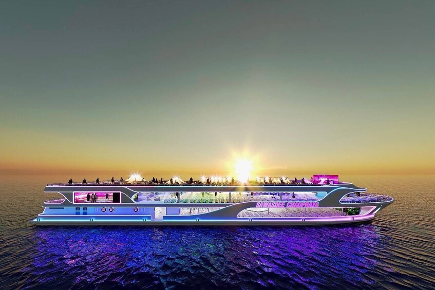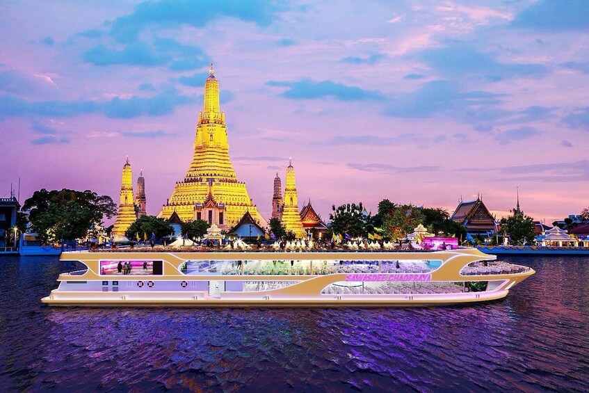 Experimente una noche inolvidable a bordo del crucero Sawasdee Chaophraya mientras se desliza a lo largo del encantador río Chao Phraya bajo el cielo nocturno de la ciudad. Disfruta del paisaje romántico en ambas orillas del río y maravíllate con lugares emblemáticos como What Kalayanamit, Pom Wichai Prasit, What Arun Ratchawararam, el Gran Palacio y el Puente Rama VIII.