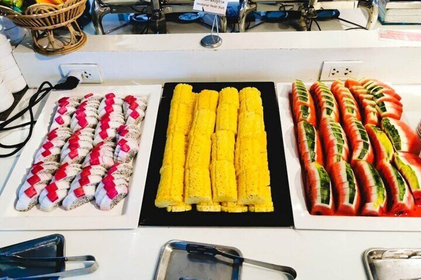 - Aperitivo & ensalada: Barra de ensalada, ensalada picante de pollo picado, cangrejo salado en leche de coco